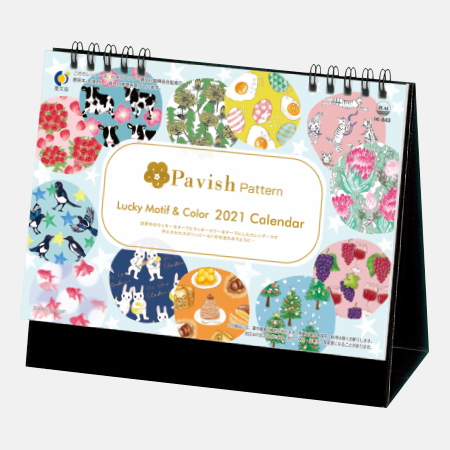 13枚もの(1ヶ月表記)世界中のラッキーアイテム&ラッキーカラーをモチーフにしたパターン(総柄)を制作しているブランド“Pavish Pattern(パビッシュ パターン)”とのコラボ企画。贈る方も贈られた方もハッピーな1年になりますように…。そんな思いを込めたカレンダーです。